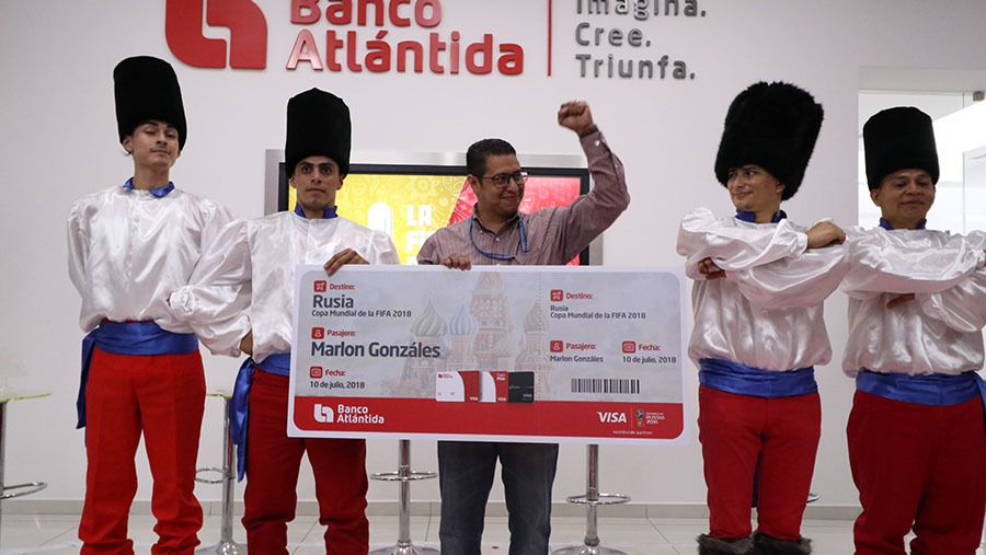 Tegucigalpa, 6 de junio de 2018.- Banco Atlántida se une a la Fiebre del Mundial de Televicentro que está haciendo palpitar a todos los hondureños con la Copa Mundial de la FIFA Rusia 2018 y para esto lanzaron la camisa oficial de la Fiebre del Mundial, que estará disponible a partir de este jueves 7 de junio, hasta agotar existencia, en las tres agencias digitales de Banco Atlántida. Para obtener estas camisas, los clientes de la institución financiera solamente deben solicitar su usuario de Atlántida Online o Atlántida Móvil y automáticamente le entregarán una de las camisas conmemorativas de la Fiebre del Mundial. Esta promoción es válida únicamente en las Agencias Digitales ubicadas en Mall Multiplaza de Tegucigalpa, Mall Galerías del Valle y Altara en San Pedro Sula. Para continuar con la fiebre mundialista, Banco Atlántida le dio la sorpresa a Marlon González, tarjetahabiente de esta institución, quien utilizando su Tarjeta de Débito Atlántida VISA, fue el ganador de un paquete, cortesía de VISA, que incluye dos boletos directos a Moscú con todos los gastos pagados, para presenciar la Final de la Copa del Mundo. Este evento se realizó en la Agencia Digital de Mall Multiplaza, en presencia de ejecutivos de Banco Atlántida, Televicentro, medios de comunicación y clientes.