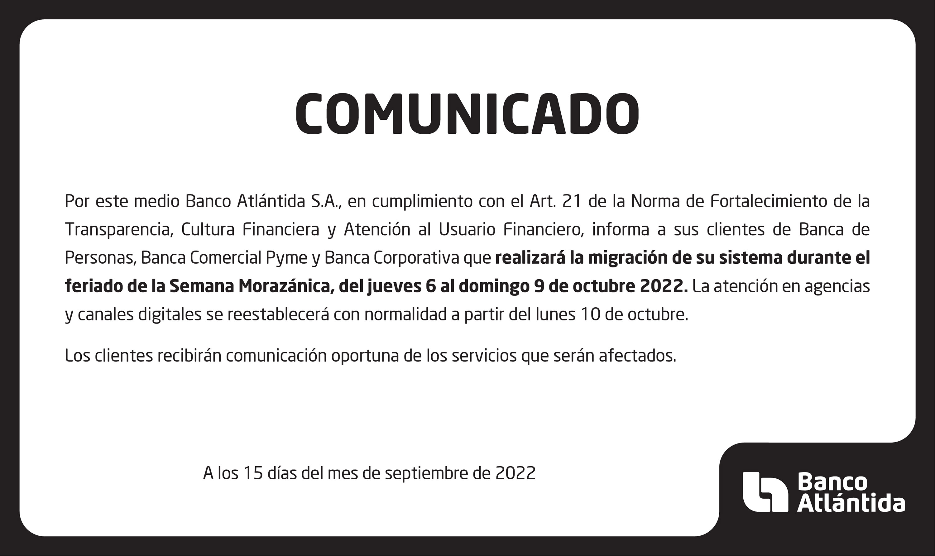 Tegucigalpa, martes 25 de octubre de 2022. - Banco Atlántida informó que se ha restablecido prácticamente la operatividad de sus canales y que ha trabajado incansablemente para resolver todas las incidencias que se habían derivado, luego de su proceso de migración tecnológica a inicios de este mes.