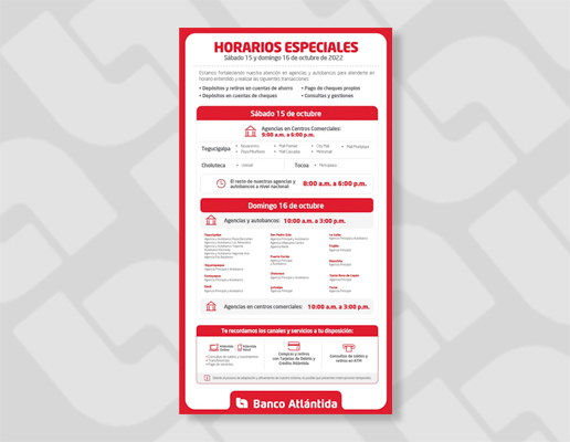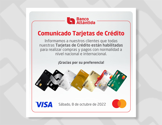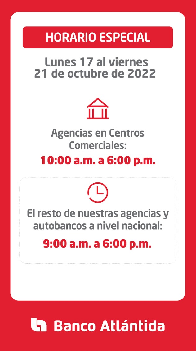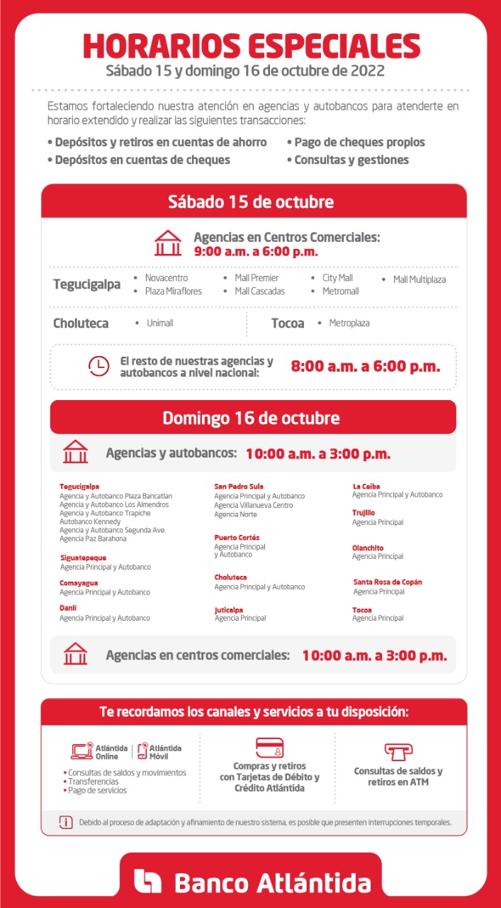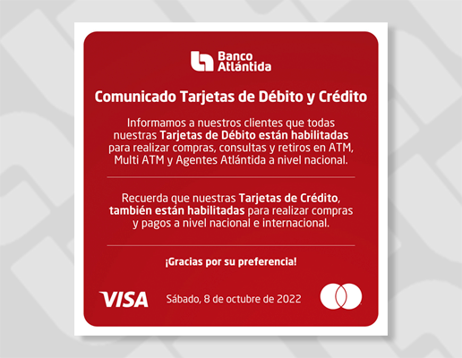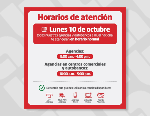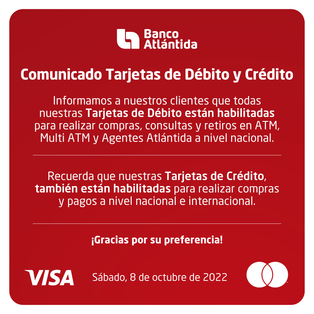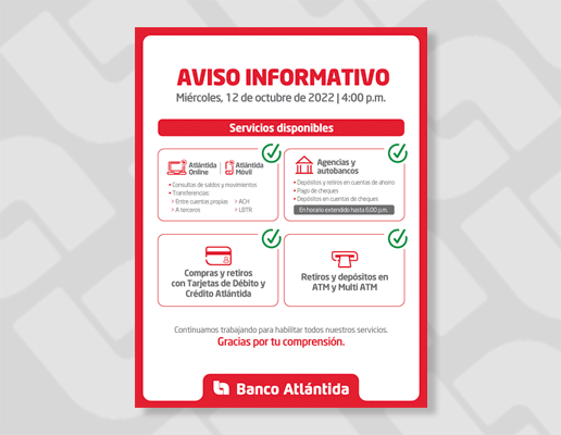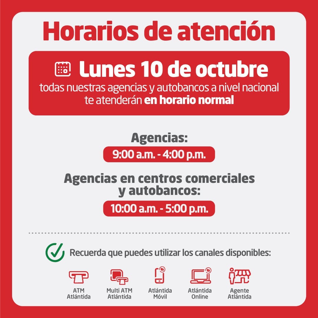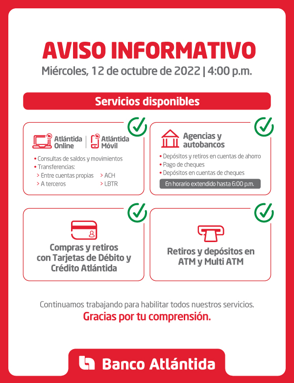 En ese sentido, la institución bancaria dio a conocer que su red de agencias, autobancos y ATM están habilitados. Agentes Atlántida, Atlántida Online y Atlántida Móvil aún pueden presentar incidencias temporales breves, que se irán solucionando conforme se retorna al nivel óptimo de funcionamiento de la plataforma digital.