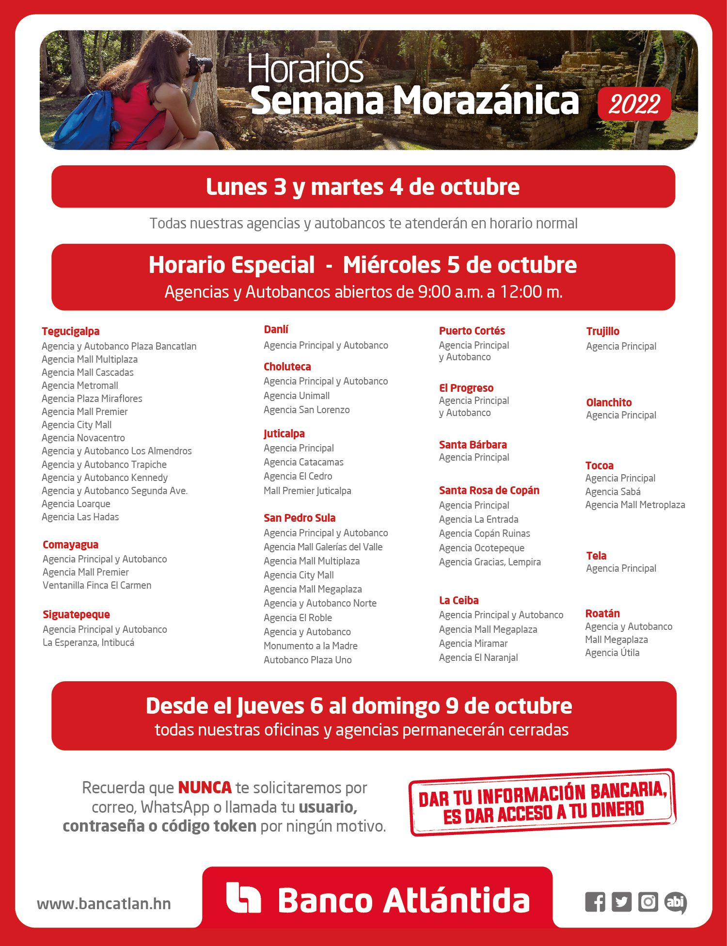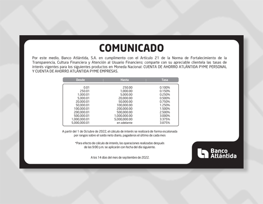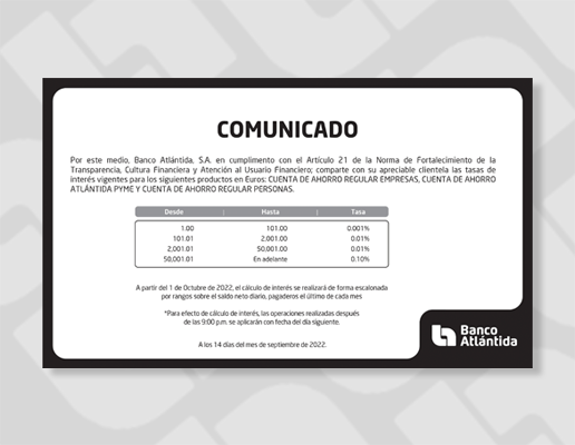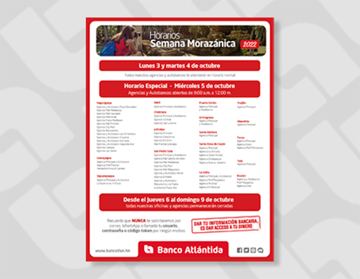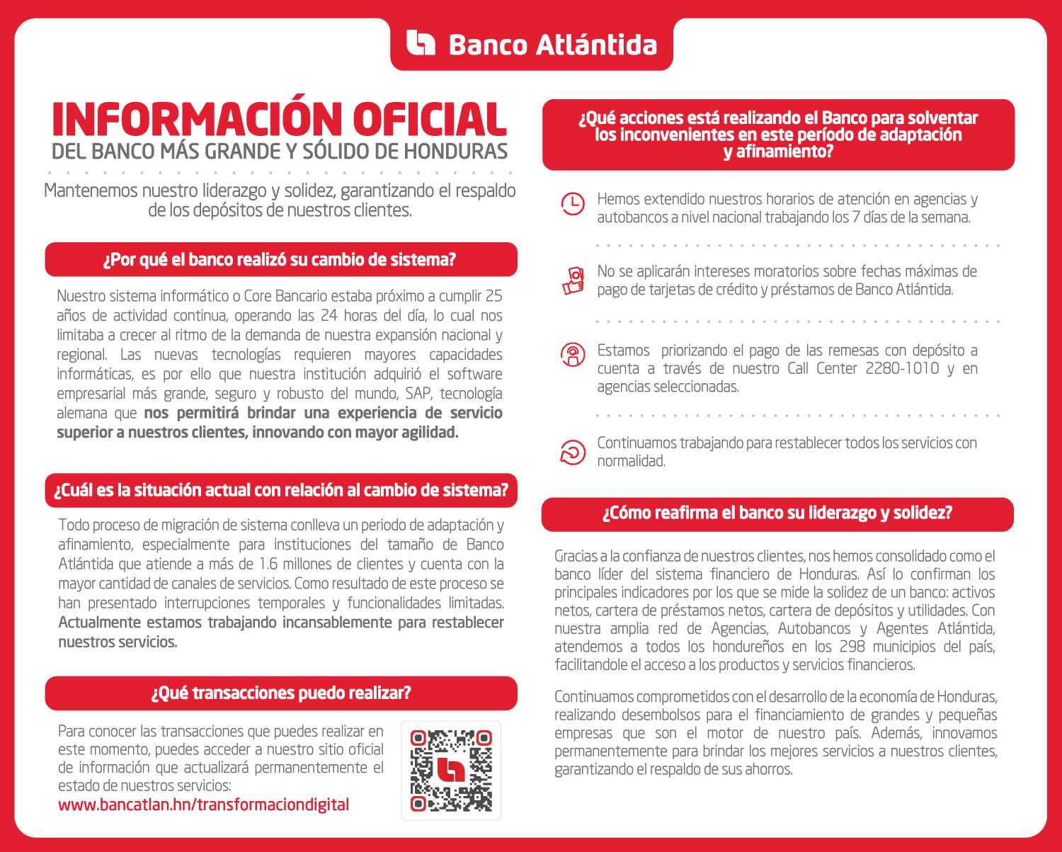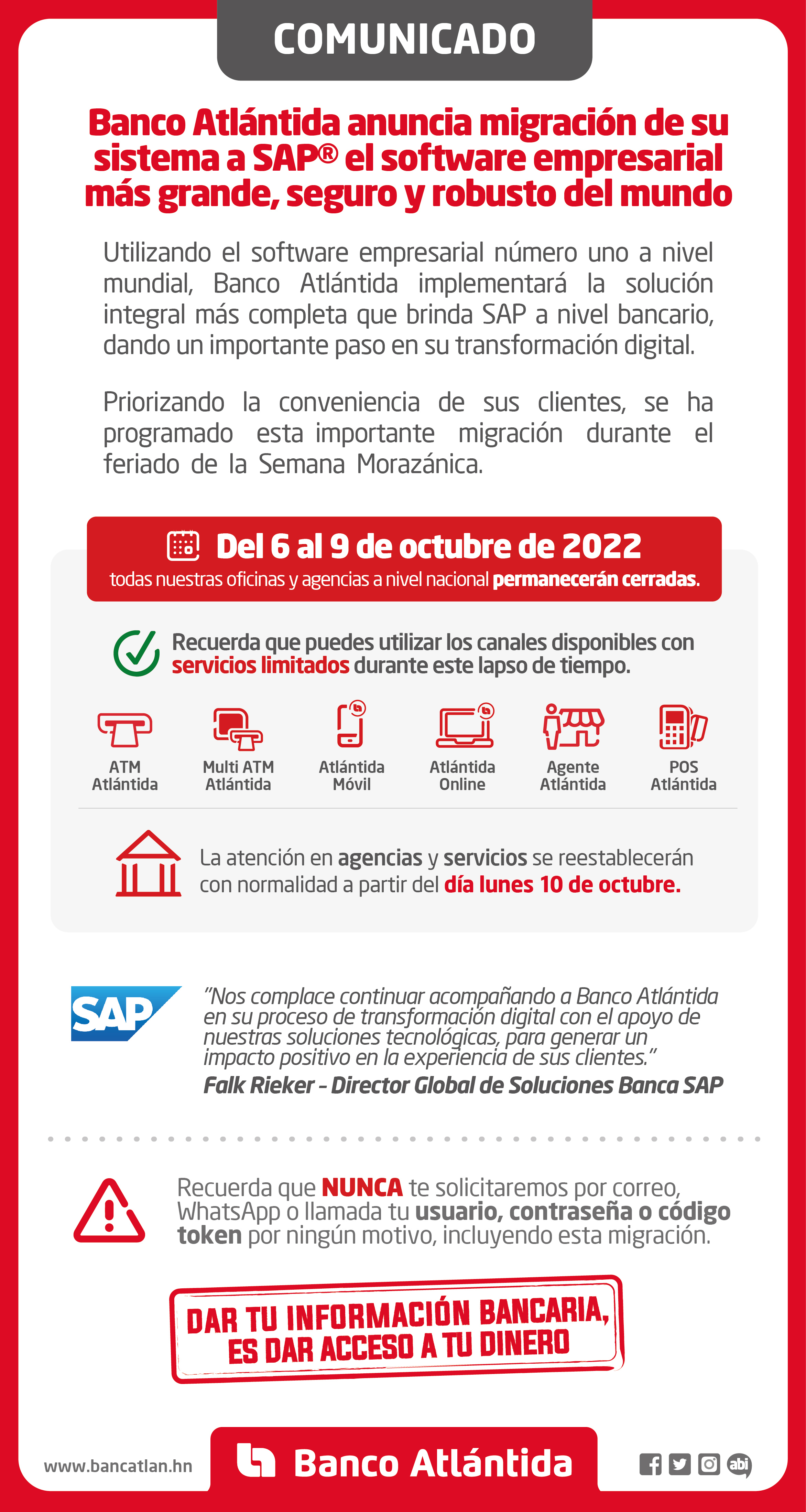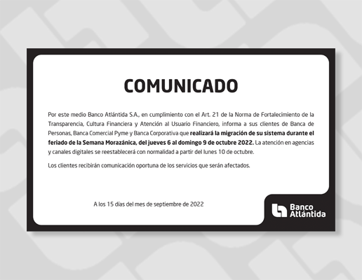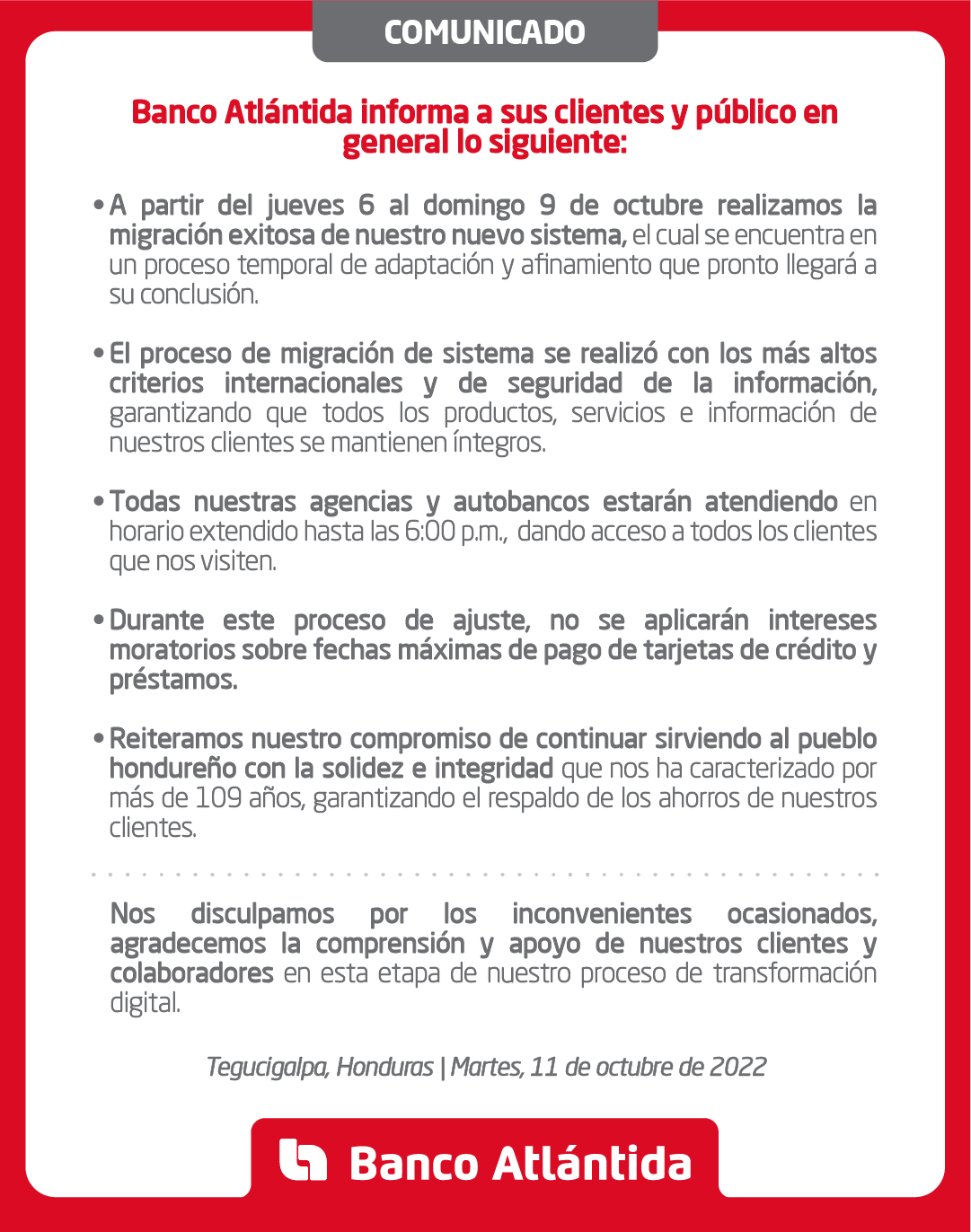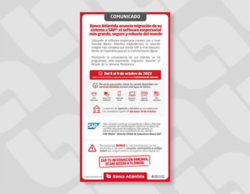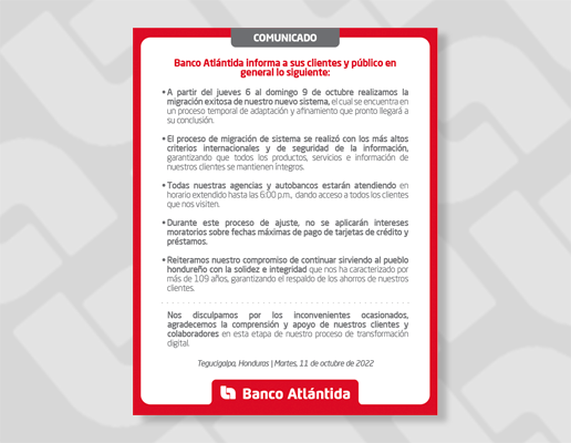 “Somos un banco con más de 100 años de experiencia, caracterizado por garantizar la seguridad de los ahorros de nuestros clientes con un respaldo sólido. Las dificultades que hemos reportado en los últimos días son estrictamente tecnológicas y no afectan nuestra solidez financiera. Este tipo de procesos conlleva un período de adaptación y afinamiento, especialmente para instituciones de gran tamaño como es nuestro caso; reiteramos nuestras disculpas por los inconvenientes generados, y agradecemos la comprensión de todos nuestros clientes de Banca de Personas, Banca Comercial Pyme, Clientes Corporativos y socios de negocio”, señaló Carlos Girón, Vicepresidente Ejecutivo de Imagen Corporativa y Comunicaciones de Banco Atlántida.