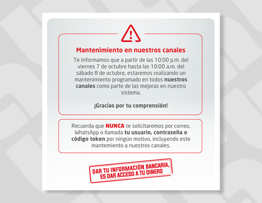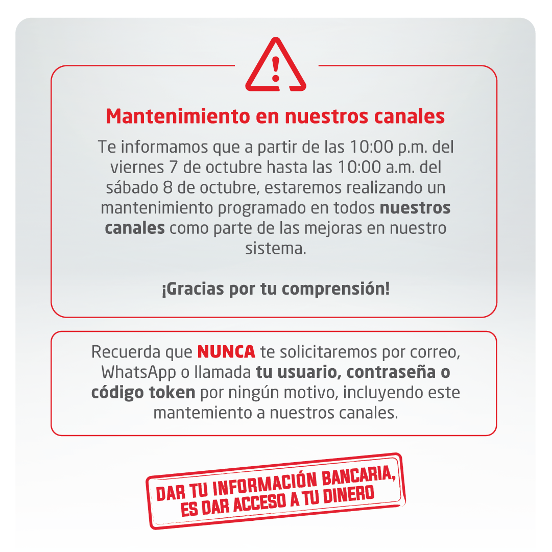 Recuerda que NUNCA te solicitaremos por correo, WhatsApp o llamada tu usuario, contraseña o código token por ningún motivo, incluyendo esta migración.